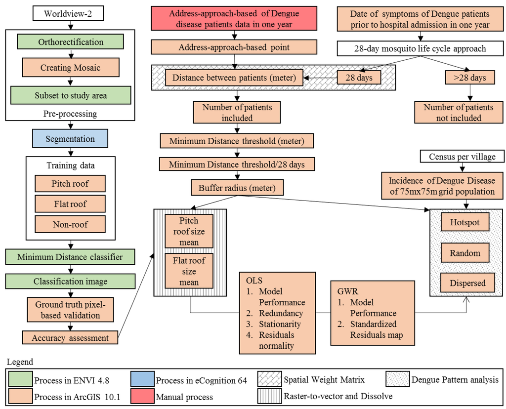Dengue disease incidence is related with the construction of a house roof, which is an Aedes mosquito habitat. This study was conducted to classify pitch roof (PR) and flat roof (FR) surfaces using pan-sharpened Worldview 2 to identify dengue disease patterns (DDPs) and their association with DDP. A Supervised Minimum Distance classifier was applied to 653 training data from image object segmentations: PR (81 polygons), FR (50), and non-roof (NR) class (522). Ground validation of 272 pixels (52 for PR, 51 for FR, and 169 for NR) was done using a global positioning system (GPS) tool. Getis-Ord score pattern analysis was applied to 1154 dengue disease incidence with address-approach-based data with weighted temporal value of 28 days within a 1194 m spatial radius. We used ordinary least squares (OLS) and geographically weighted regression (GWR) to assess spatial association. Our findings showed 70.59% overall accuracy with a 0.51 Kappa coefficient of the roof classification images. Results show that DDPs were found in hotspot, random, and dispersed patterns. Smaller PR size and larger FR size showed some association with increasing DDP into more clusters (OLS: PR value = −0.27; FR = 0.04; R2 = 0.076; GWR: R2 = 0.76). The associations in hotspot patterns are stronger than in other patterns (GWR: R2 in hotspot = 0.39, random = 0.37, dispersed = 0.23).