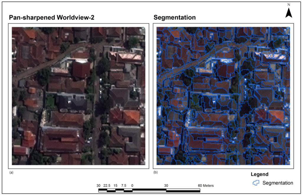 Figure 2 depicts data preparation and analytical procedures. An ortho-ready standard level-2A (ORS2A) archive pan-sharpened image of Worldview 2 (WV2) with 0.5 ground sample distance (GSD) and red, green, and blue (RGB) color composite was acquired on 2 July 2011 as three images covering the study area. The delivered product license was purchased by the district development plan government agency (BAPPEDA) in Bandung city, Indonesia. This image was only provided by the government in RGB band color composite, not in full 8-bands. Orthorectification was performed in ENVI 4.8 by application of a rational function model that was already included in the folder of the product. The imageries were then mosaicked in ArcGIS to obtain full imagery. A subset of the imagery was done in ENVI to obtain the only image covering the study area. This imagery (in ENVI image format) was loaded in the eCognition 64 software package (Trimble Geospatial Imaging) for the segmentation process. Multiresolution segmentation, an algorithm used for segmenting HSR imagery, has been used widely and has achieved good accuracy []. It is a bottom-up region-merging technique from pixel level into image object (IO) polygon level using three parameters: scale, shape, and compactness [,,]. We set algorithm parameters to obtain the best polygons for each of the objects in the imagery by inserting parameters previously used for real-color composite of RGB color composite orthophotos on the pixel level: 10 on scale, 0.5 shape, and 0.9 compactness, into the software. This level was still in pixel level polygons, which did not convey meaningful IO. For the IO level, trial-and-error segmentation processing is necessarily performed to assure visual pure objects belonging to only one class [,,]. Given this process, we continued to try several algorithm parameters scaled from 20 to 100. Then, we got a 20-scale parameter because that was the scale that showed pure objects according to our visual interpretation. Figure 3 presents an RGB color composite of a pan-sharpened image and the segmentation result. From eCognition, this result was saved as a shapefile. We used this segmentation to produce training data by choosing polygons from the segmentation, matching with the imagery to decide which is PR, FR, and non-roof (NR). We collected 653 training data from segmentation IO polygons of the WV2 imagery. From those, we made three region of interests (ROIs) polygons consisting of 81 polygons belonging to the PR class, 50 FR; the rest (522) were NR class. Regarding the number of training data, previous reports described that the number of IO polygons used for training data varied between 18–63 polygons per class [].