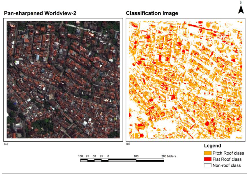 An excellent means of controlling dengue disease pandemics is to monitor and intervene in environmental conditions []. Environmental factors that have been mapped for dengue vector breeding habitats include vegetation, water bodies, and land cover []. Built-up surfaces of urban structures constitute a major factor because of their higher probability of becoming a breeding habitat []. Earlier studies have pointed out that, of urban structures, houses play a major role as a habitat for dengue vectors [,]. Roof construction presents a potential risk for Aedes mosquito breeding sites []. As part of roof construction, a flat roof (FR) made of waterproof material [] presents a high probability for water to flow with lower velocity than a pitch roof (PR) []. The former harbors stagnant water when both gutters are blocked [,]. All outdoor oviposition showed a relation with indoor abundance of adult female mosquitoes and can engender higher rates of oviposition inside homes where water containers are most frequently found [,]. In Indonesia, issuance of government regulations related to cleaning roof areas is still uncommon. Accordingly, health promotion campaigns related to such issues are nonexistent. In a neighboring country (Australia), cleaning roof gutters is also uncommon, but one study has found them to be a productive habitat for Aedes mosquitoes []. We inferred that identifying pitched and flat roofs is a good approach to identify roof gutters, although not every house roof has a roof gutter.