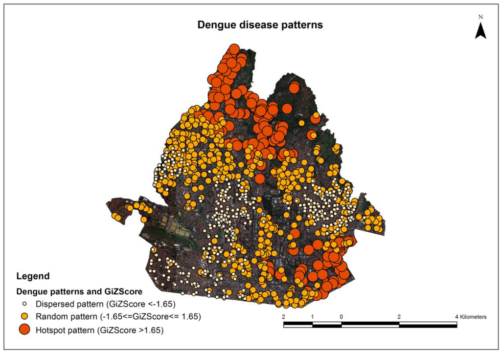 Dengue disease pattern (DDPs) refer to a variable that we derived from the incidence of dengue disease and then analyzed in ArcGIS based on address-based disease locations and dates of disease symptoms. The incidence of dengue disease is a rate measurement of number of cases per number of population at-risk [,]. Populations at-risk were approached by dividing census data of each village by number of grids sized 75 m × 75 m on inhabited areas. The population in each grid was assumed as population at-risk because the size of the grid remained in the Aedes mosquito flight range []. The grid size was approached based on the approximate size of one rukun tetangga (RT) or block in Bandung city that consists of about 30–75 houses (each house estimated as about 72 m2) according to the city regulations. This method was a modification from that used by Kumar et al., who applied a 100 m × 100 m grid for built-up land density [,]. The incidence of the disease was then obtained and used for analyzing DDP using Hotspot analysis or Getis-Ord Gi (GiZ) in ArcGIS 10.1 toolbox that can output numeric continuous data and which can identify statistically significant hotspots, random and also dispersed patterns [,]. We used the dengue pattern of GiZ score as a hotspot or clustered pattern (GiZ Score > 1.65), random (−1.65 ≤ GiZ Score ≤ 1.65), and dispersed pattern (< −1.65) based on a previous study [,]. These DDP patterns were used as dependent variables for regression analysis. This analysis was the most common approach. It is most likely to require public health intervention []. The spatial autocorrelation coefficient Moran’s I (+1 to −1) analysis was measured to evaluate the independence of residuals. A positive value means that the adjacent values tend to be similar, whereas a negative value implies dissimilarity [].