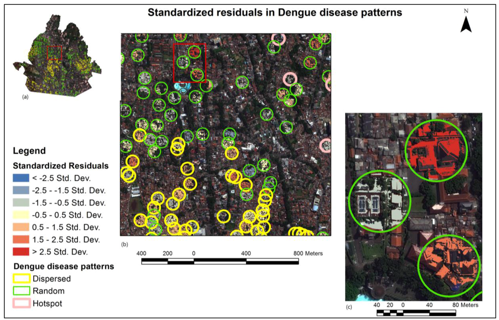 (a) Standardized residuals in DDP; (b) standardized residuals are shown within hotspot, random, and dispersed patterns; and (c) closer examination of the residuals on roofs.