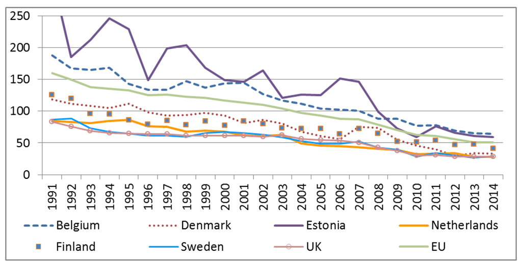 As in many European countries, road safety in Finland has steadily improved over the past decades (Figure 1). Unusually harsh winters with more than average crashes, or winters in which a few crashes with a large number of fatalities occurred, are reasons for deviations from the trend in some years.