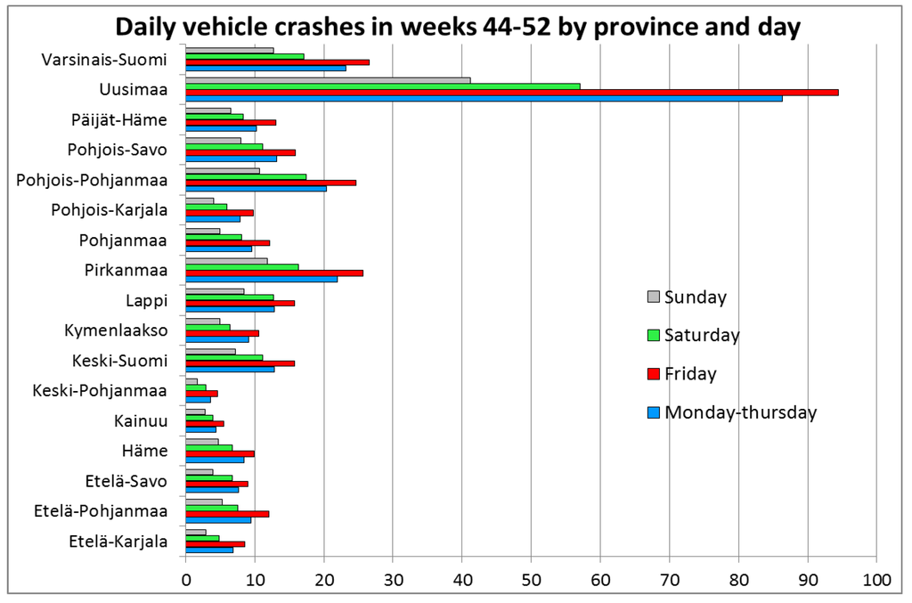 Due to the variation in the size of the regions and car fleet, and different degrees of transit functions in inter-regional transport, crash rate is used as the independent variable instead of the absolute number of crashes. It enables easier comparison between days of the week and seasons with respect to other risk factors than traffic volume. The effect of traffic volume on the total number of crashes per day can eventually be added (by region, season, etc.).