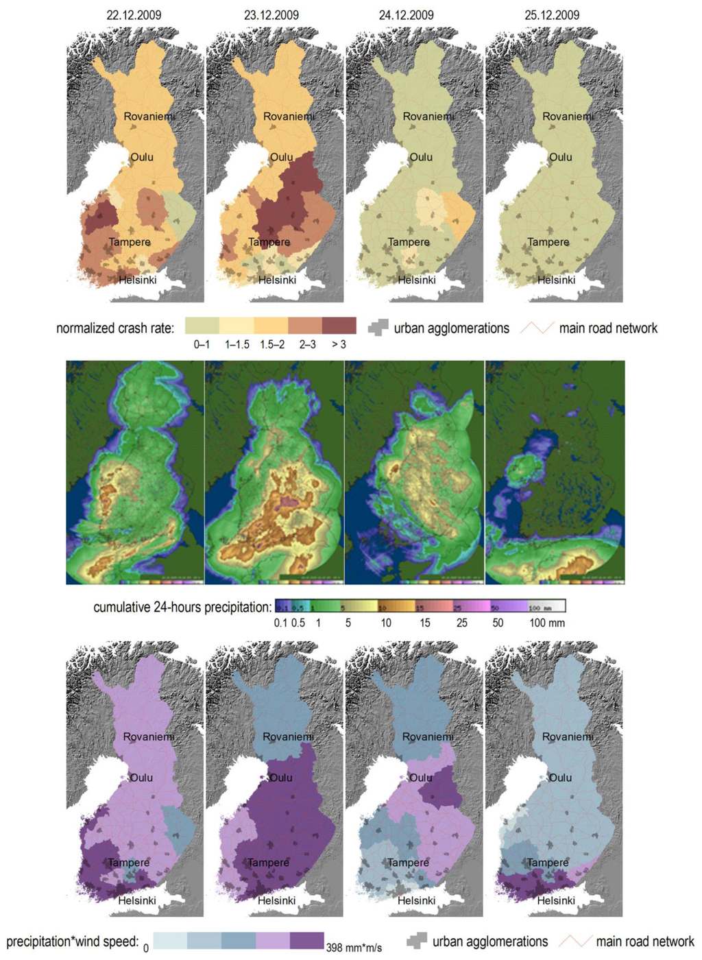 Spatially defined differences in the crash risk are, among others, related to traffic intensity, due to for instance higher population density in certain areas, but also to spatially defined differences, which often relate to weather conditions. Variations in the physical geography of regions often translate into structural differences in crash-relevant weather patterns. For instance, coastal provinces are subject to higher average and higher maximum wind speeds than inland regions (except for the hill tops in Lapland, but there is no traffic). The best way to illustrate this connection is to consider crash rates in different regions in relation to severe weather trajectories. Over the course of an unfolding storm trajectory during a day, detrimental conditions for traffic will not appear in the same location at the same time, or even do not appear at all in many regions located in the storm trajectory. Figure 4 illustrates this spatial variation for an extensive storm event over Finland during a nine-day period in December 2009. The first (upper) set of maps displays the daily crash rate per NUTS-3 region, normalized by the baseline average daily crash rate for the period November–December. The second (middle) set displays radar derivatives of the cumulative precipitation volume for each day. The third (lower) set displays the product of average wind speed and precipitation per day and region.