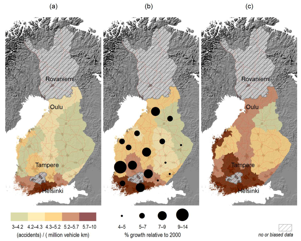 (a) Road vehicle crash rates (per million vehicle kilometers) in normal weather conditions in 2000 per Finnish province; (b) Crash rates in normal weather conditions in 2010, and growth from 2000; (c) Crash rates in very bad weather conditions in 2010. The colour scale divisions are common for all maps.