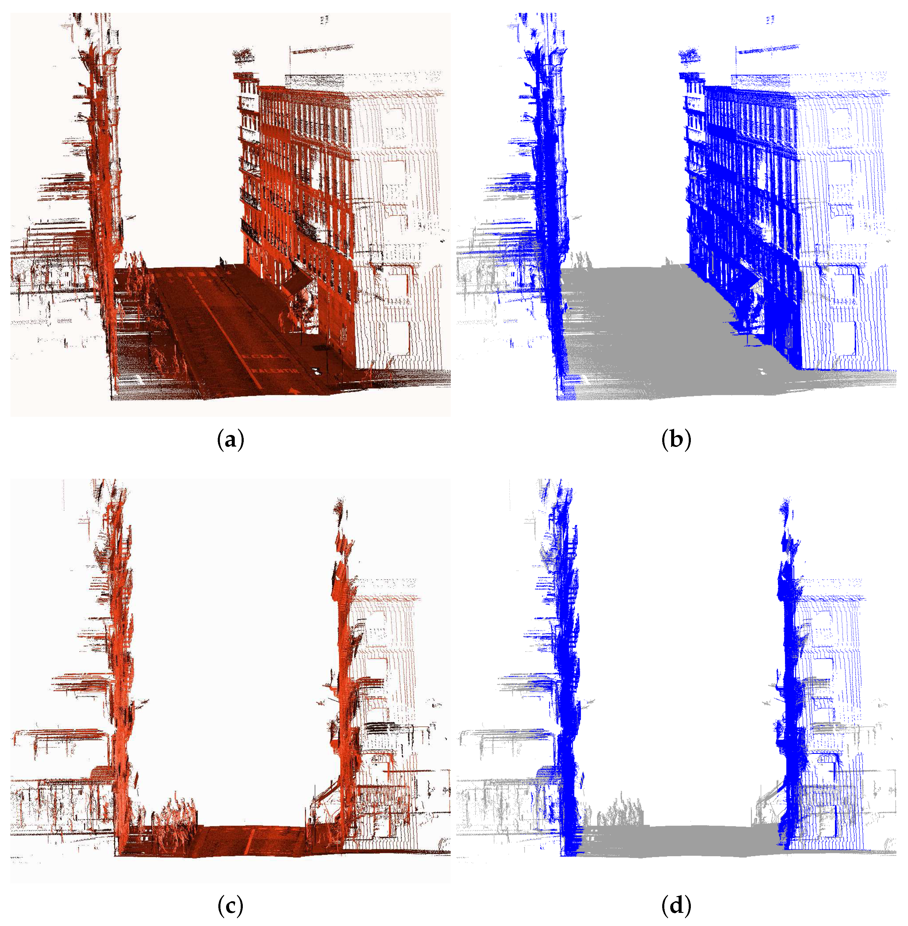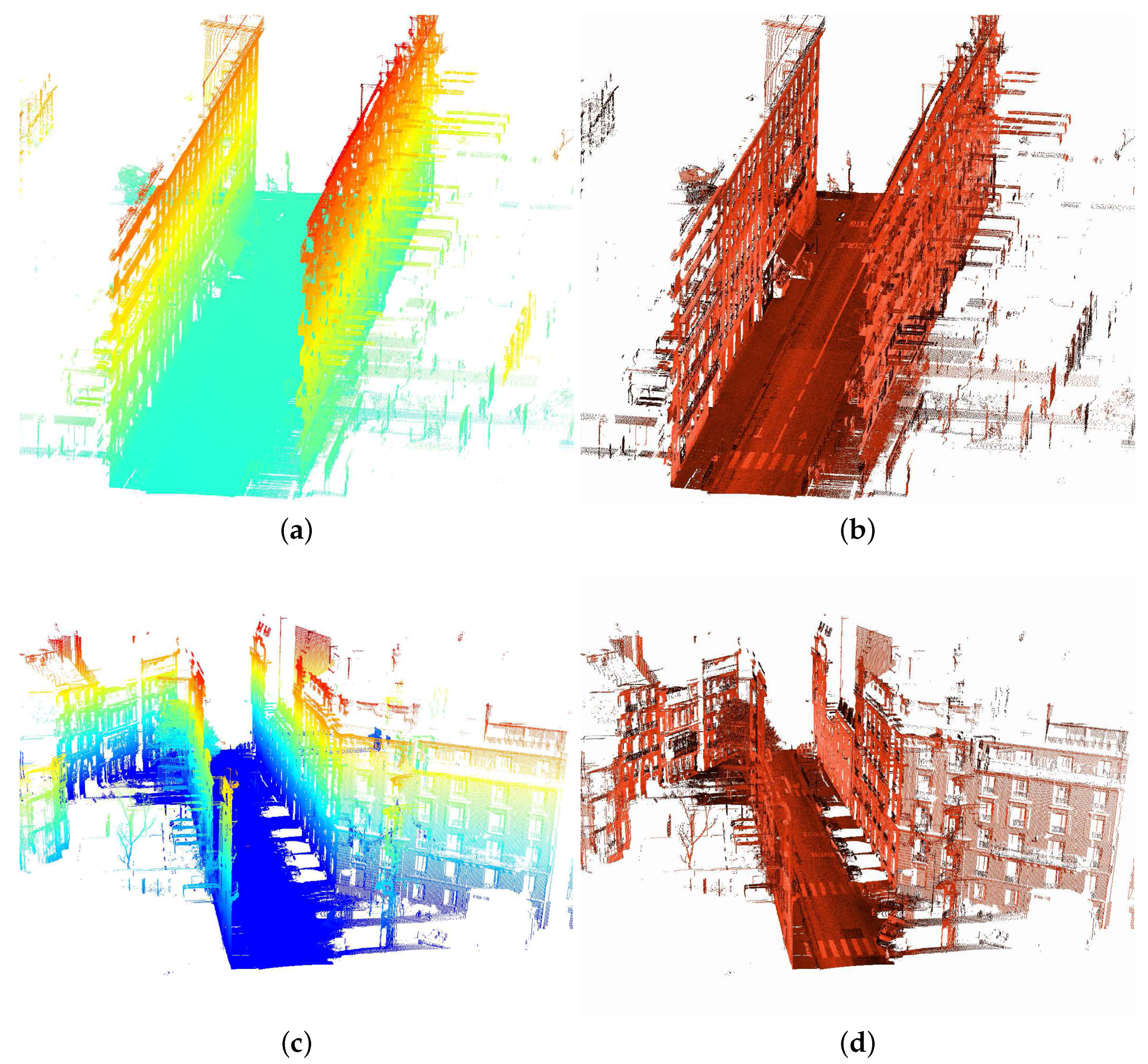 3D point clouds from two test sites in rue d’Assas in Paris, France. Stereopolis II, IGN©. Note that façades constitute the highest and longest vertical entities in the urban scene. (a) Point cloud colored by the Z coordinate; (b) Point cloud colored by the Intensity; (c) Point cloud colored by the Z coordinate; (d) Point cloud colored by the Intensity.
