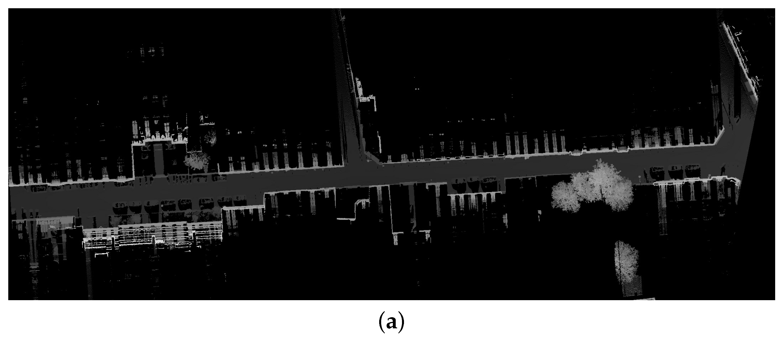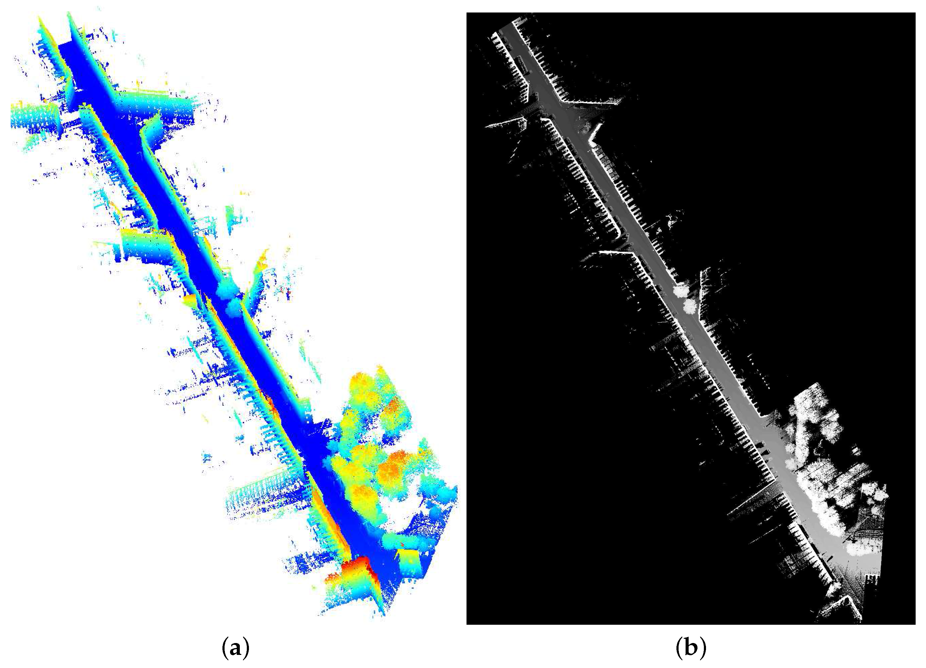 3D point clouds and elevation images for a test site in Paris, France. Data acquired by Stereopolis II, IGN©France. (a) Rue d’Assas: point cloud; (b) Rue d’Assas: elevation image.