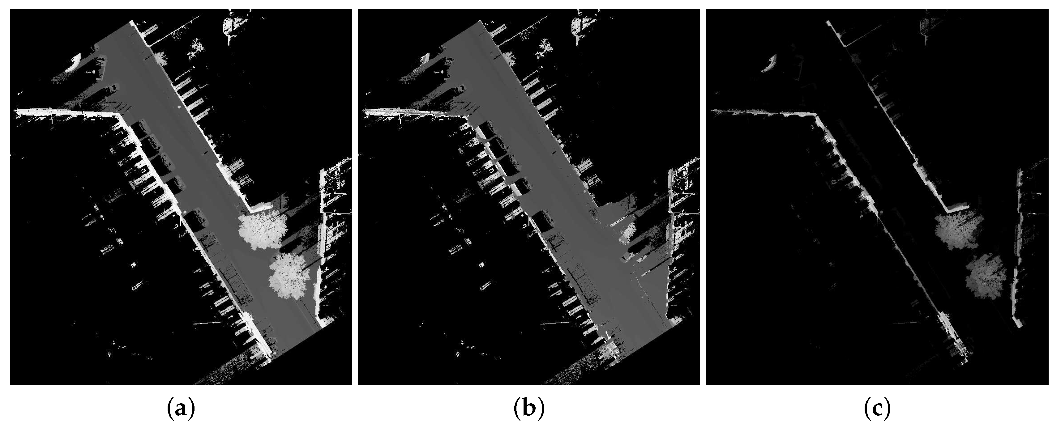 Elevation images from a test site in rue d’Assas in Paris, France. Stereopolis II, IGN©. (a) Maximal elevation image ; (b) Minimal elevation image ; (c) Height image .