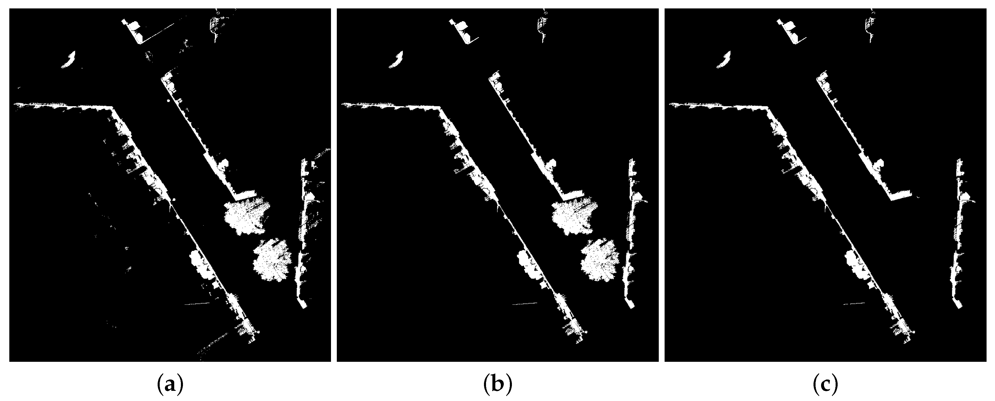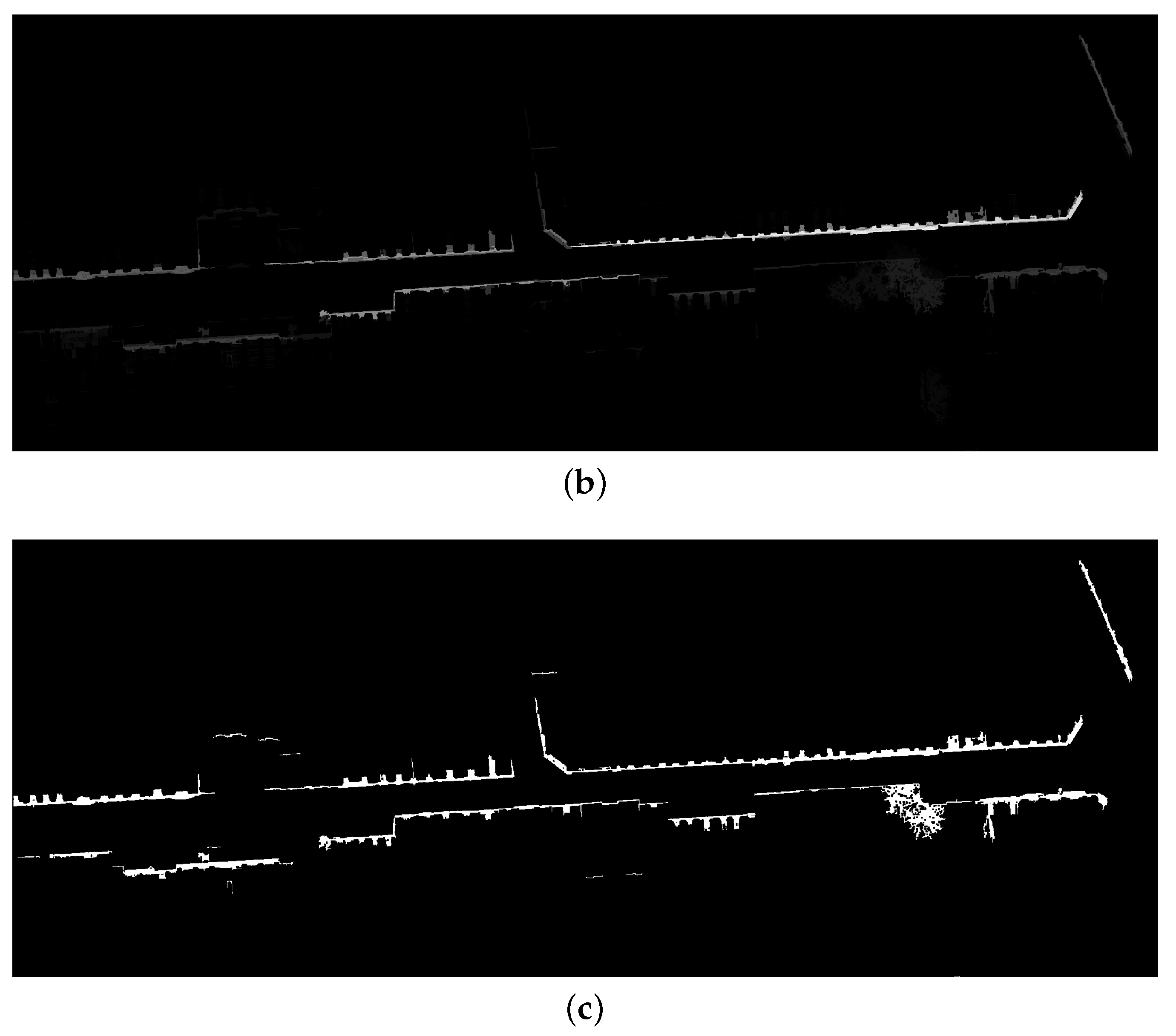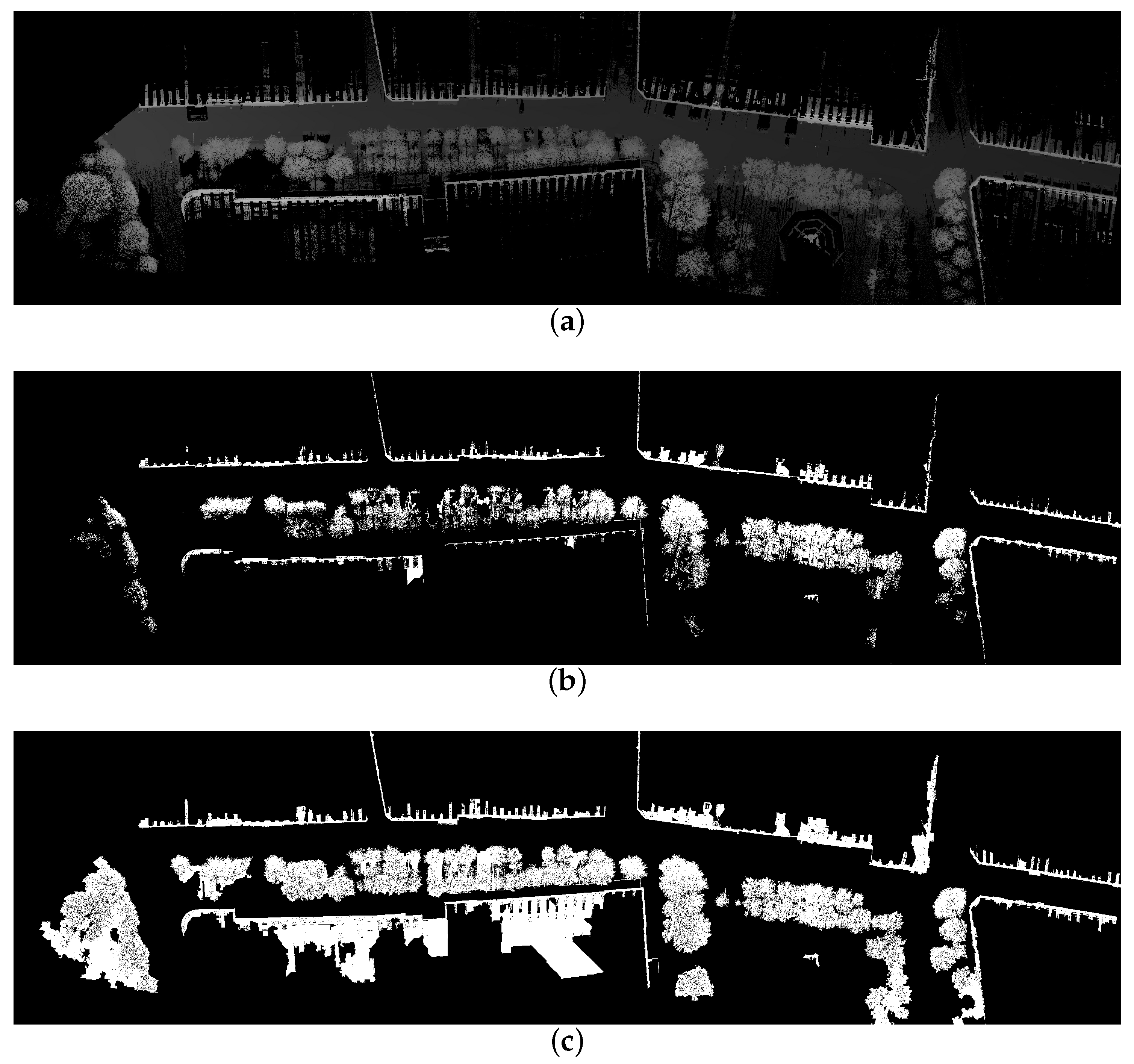 Façade marker extraction. Markers are represented with white pixels: (a) Points higher than ; (b) Points higher than and longer than ; (c) Façade markers : points higher than , longer than and less circular than . Test site in rue d’Assas (Paris).