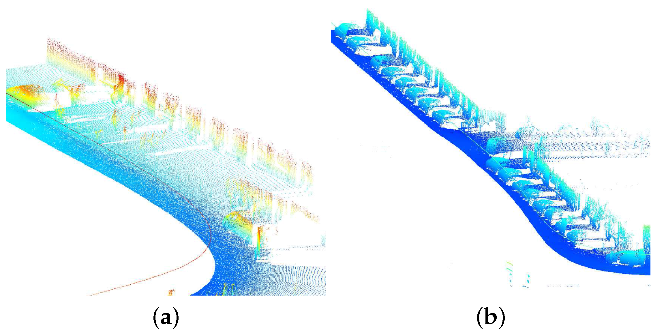 3D point clouds when laser is oriented to the ground. 3D point clouds are colored by elevation. (a) Bend and (b) straight street sections in rue Vaugirard (Paris). Stereopolis II, IGN©.