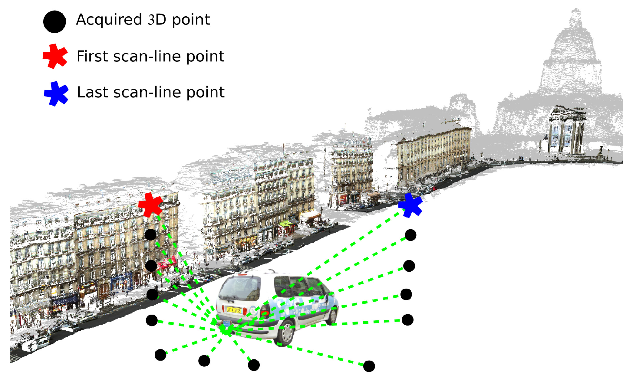 Mobile laser scanning (MLS) acquisition cycle. The first and the last point are taken as façade markers. Test site in rue Soufflot in Paris, France. LARA-3D, CAOR-MINES ParisTech©.