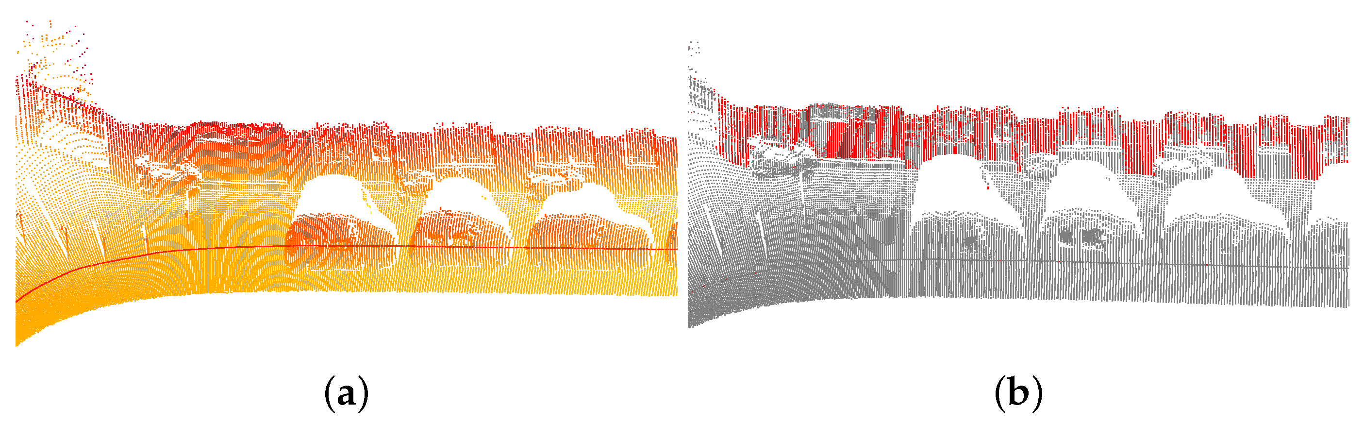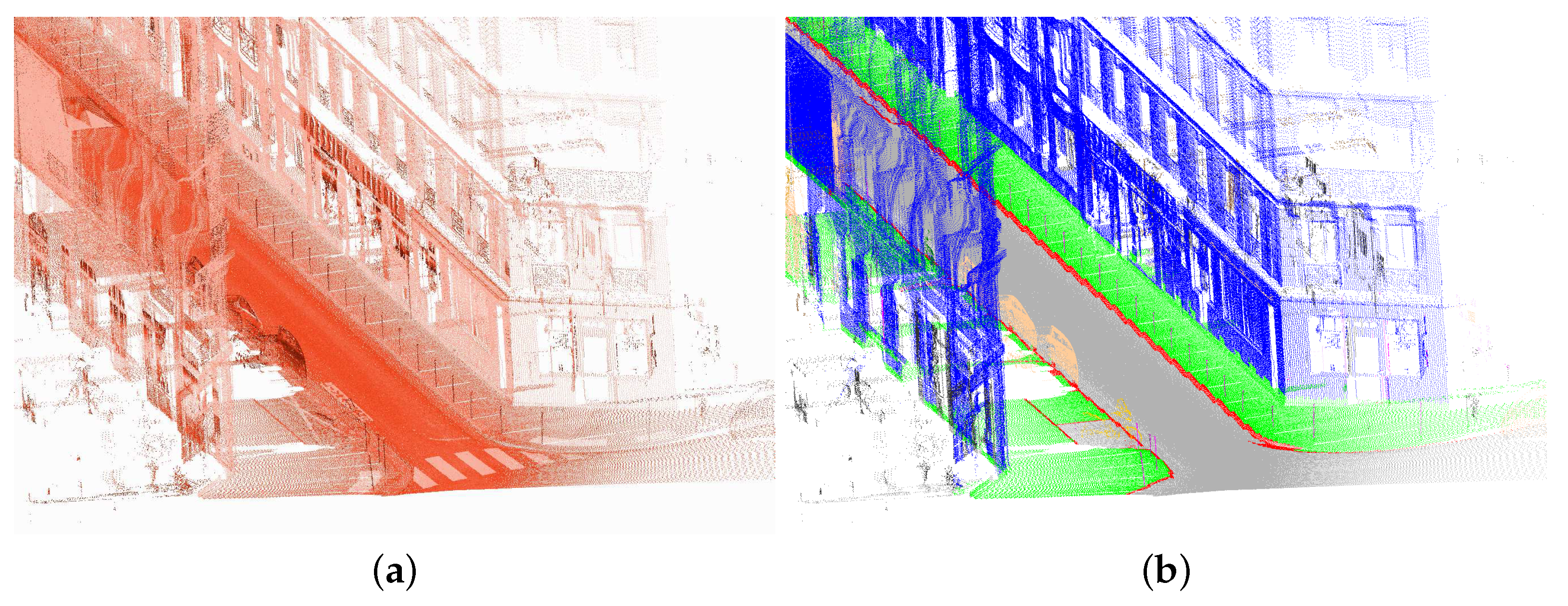 Façade markers reprojected onto the 3D point cloud. During this acquisition, the laser sensor was oriented to the ground. Note that markers only represent partial façades, therefore a façade reconstruction process is required, as explained in SubSection 4.2. Test site in rue Vaugirard in Paris, France. Stereopolis II, IGN©. (a) 3D point cloud colored by the Z coordinate; (b) Façade markers (red), other (gray).