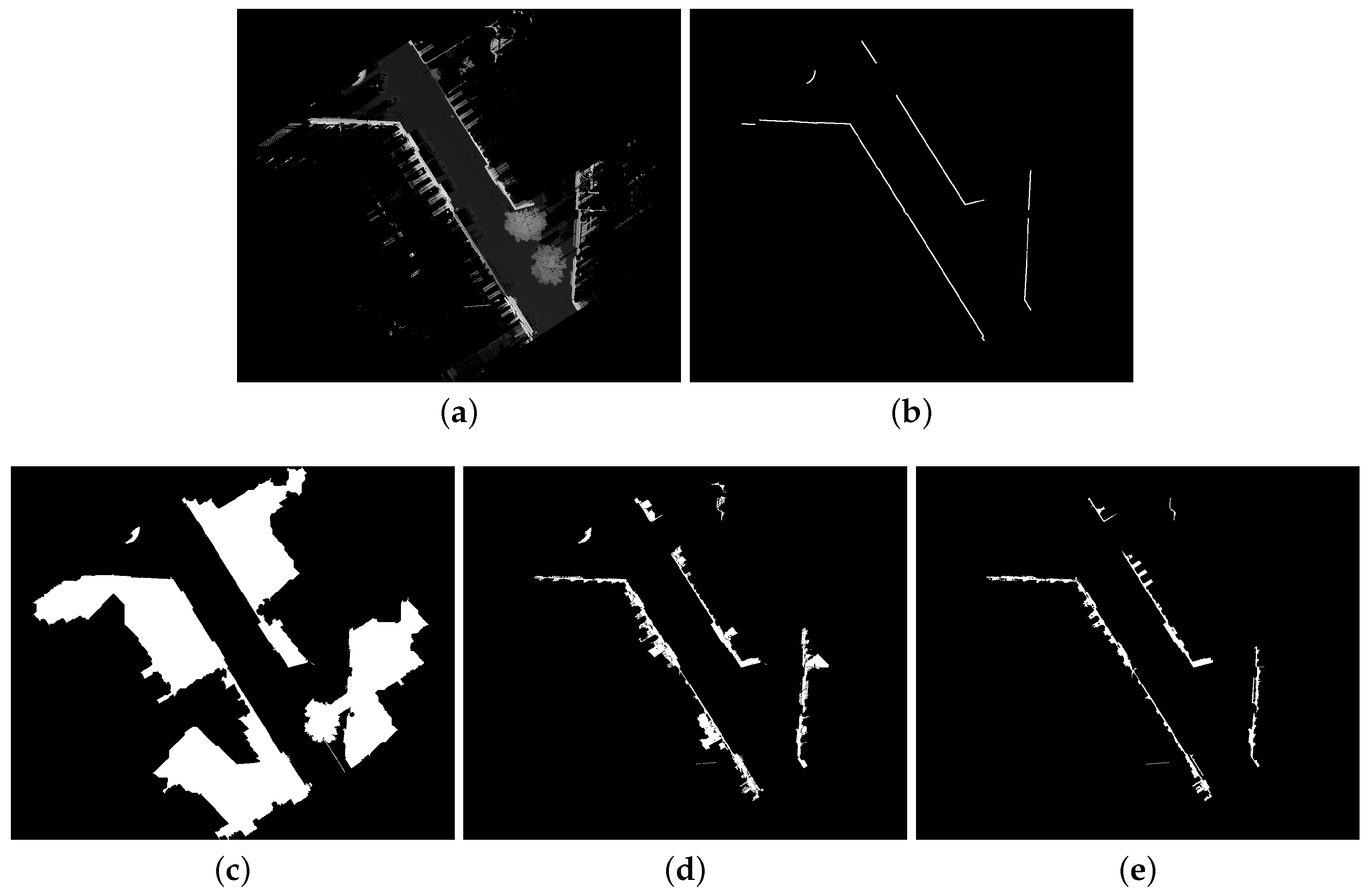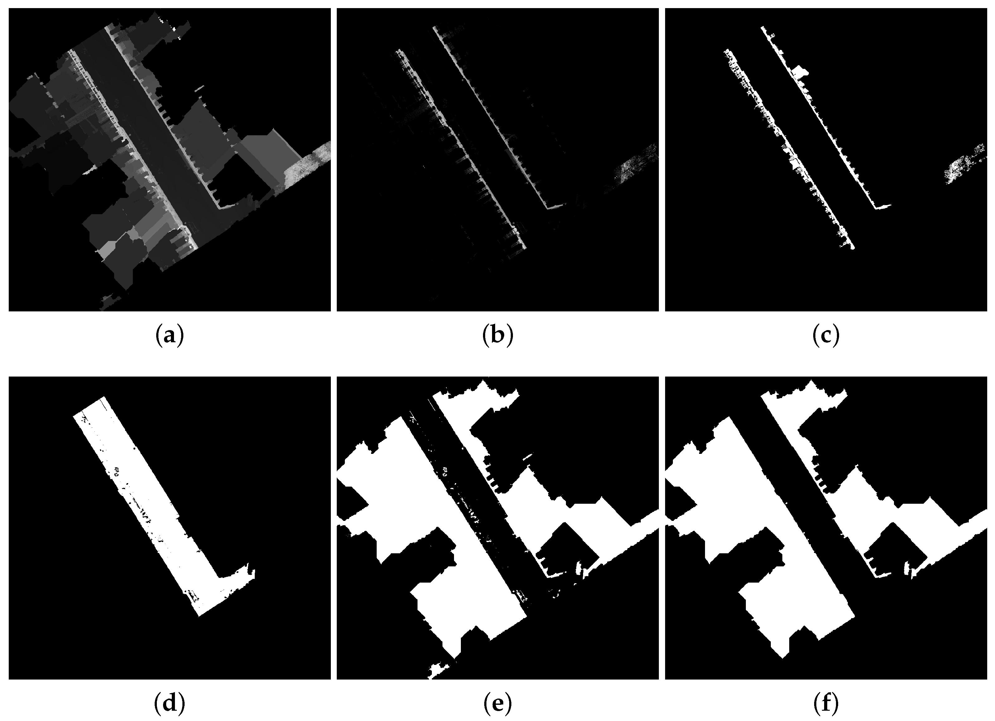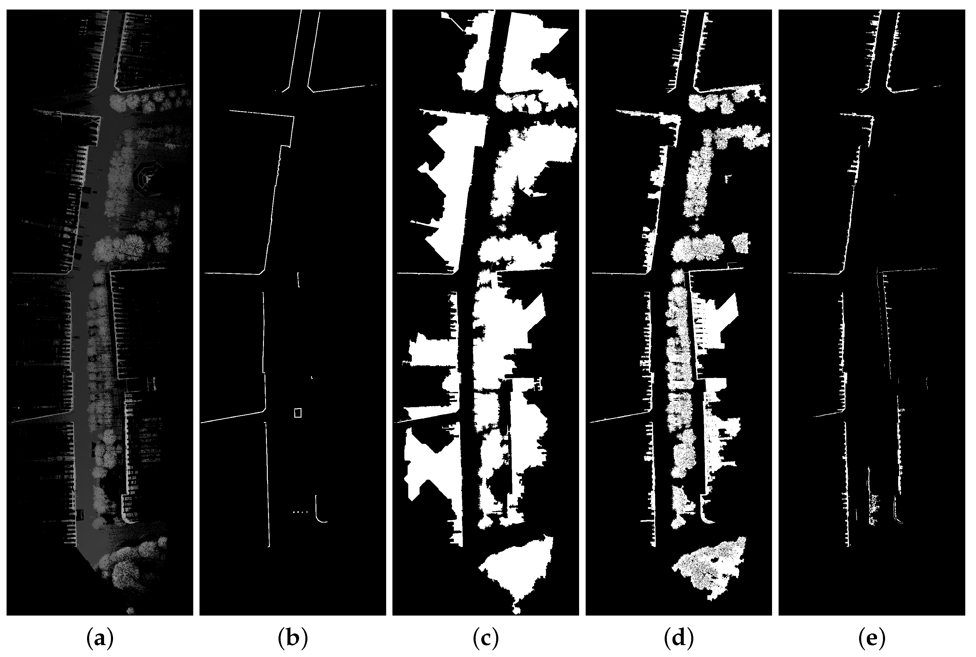 As aforementioned, our method is based on projection images. 3D point clouds are projected to elevation images because they are convenient structures to visualize and to process data. One can utilize all the large collection of existing image processing tools, in particular mathematical morphology [27,28]. Additionally, images can be processed quickly, implicitly define neighborhood relationships and require less memory than 3D data. In general, the idea of deriving elevation images from 3D point clouds is not new. Nevertheless, the development of accurate and fast urban analysis algorithms is still an open problem.