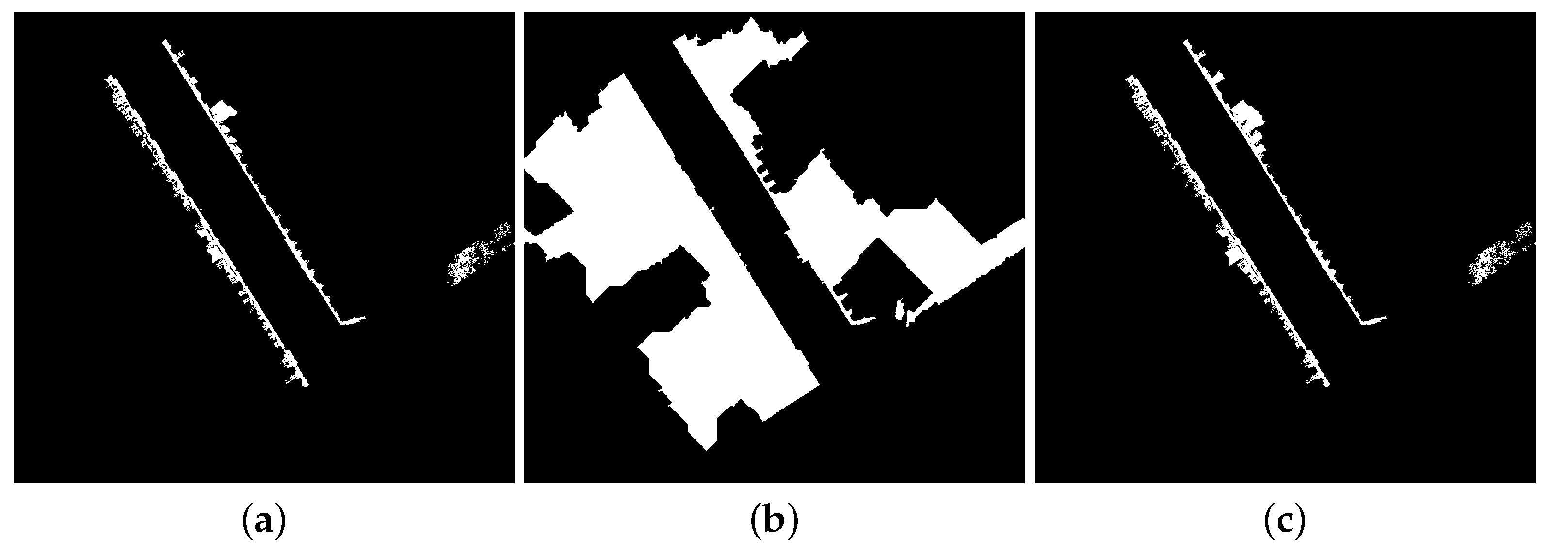 Comparison of façade segmentation methods using reconstruction by dilation and attribute controlled reconstruction on the ground residue image. Test site in rue d’Assas in Paris, France. Stereopolis II, IGN©. (a) Façade markers ; (b) Reconstruction by dilation ; (c) Attribute controlled reconstruction .