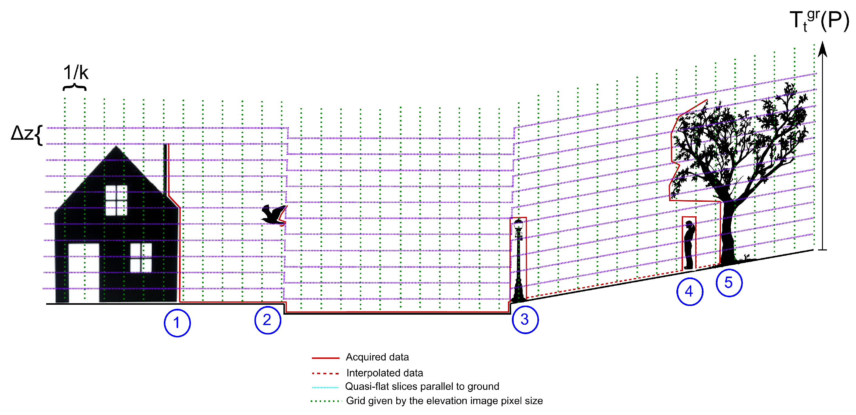 According to these assumptions, the number of pixels per unit of length is the only free parameter. In order to simplify this selection, we assume . It has to be carefully chosen. On the one hand, if k is too small, fine details are not preserved because too many points would be projected on the same pixel. On the other hand, too large k implies connectivity problems and large image sizes, which implies higher computational time that would no longer justify the use of elevation images instead of 3D point clouds. This parameter is the most critical in terms of quality versus processing time. In our experiments, we have chosen pix/m thanks to a priori knowledge about point cloud density.
