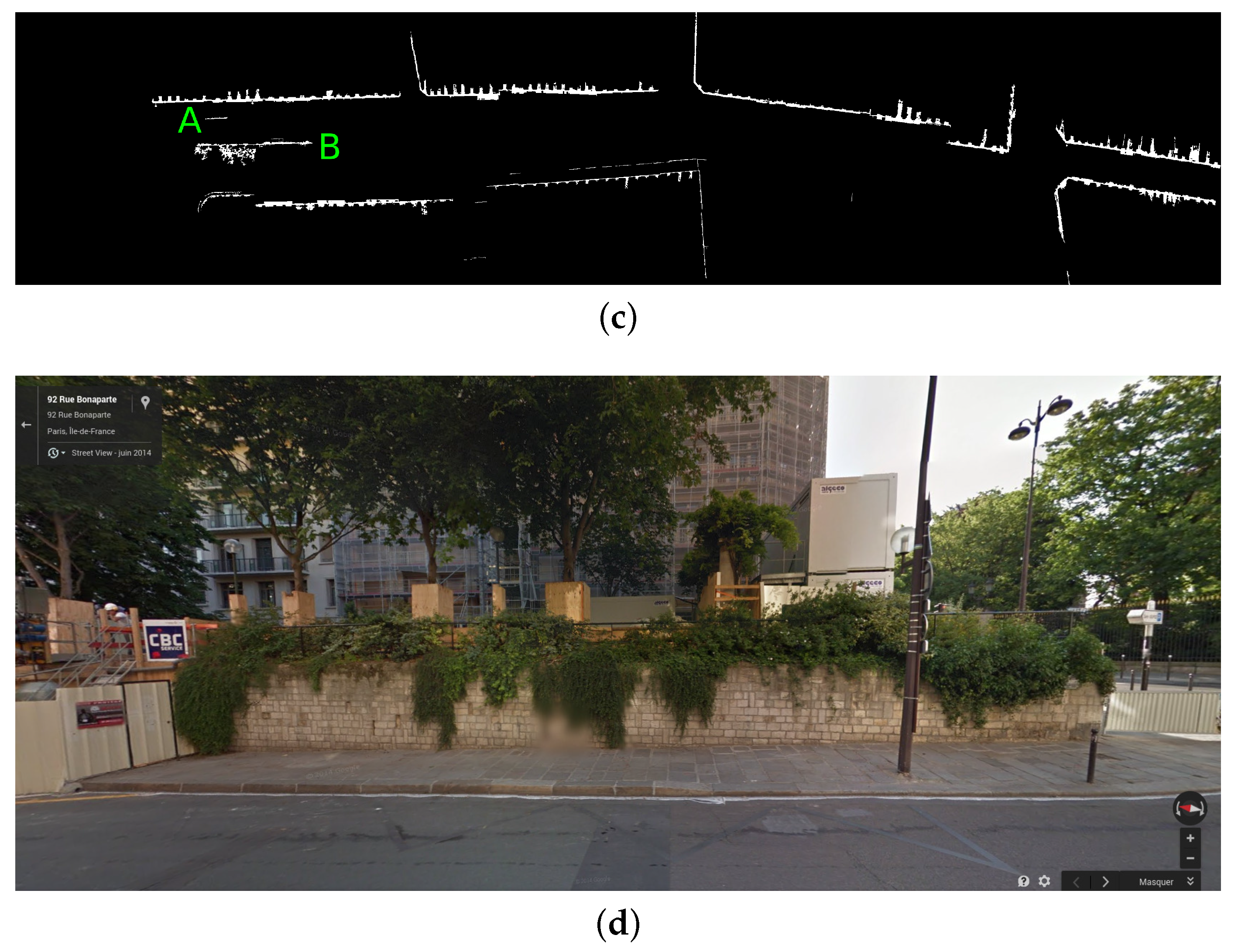 Figure 7 illustrates façade marker extraction when the laser sensor is oriented to the ground. Figure 7b presents the façade markers reprojected onto the 3D point cloud. The test site corresponds to a street section in rue Vaugirard in Paris, France.