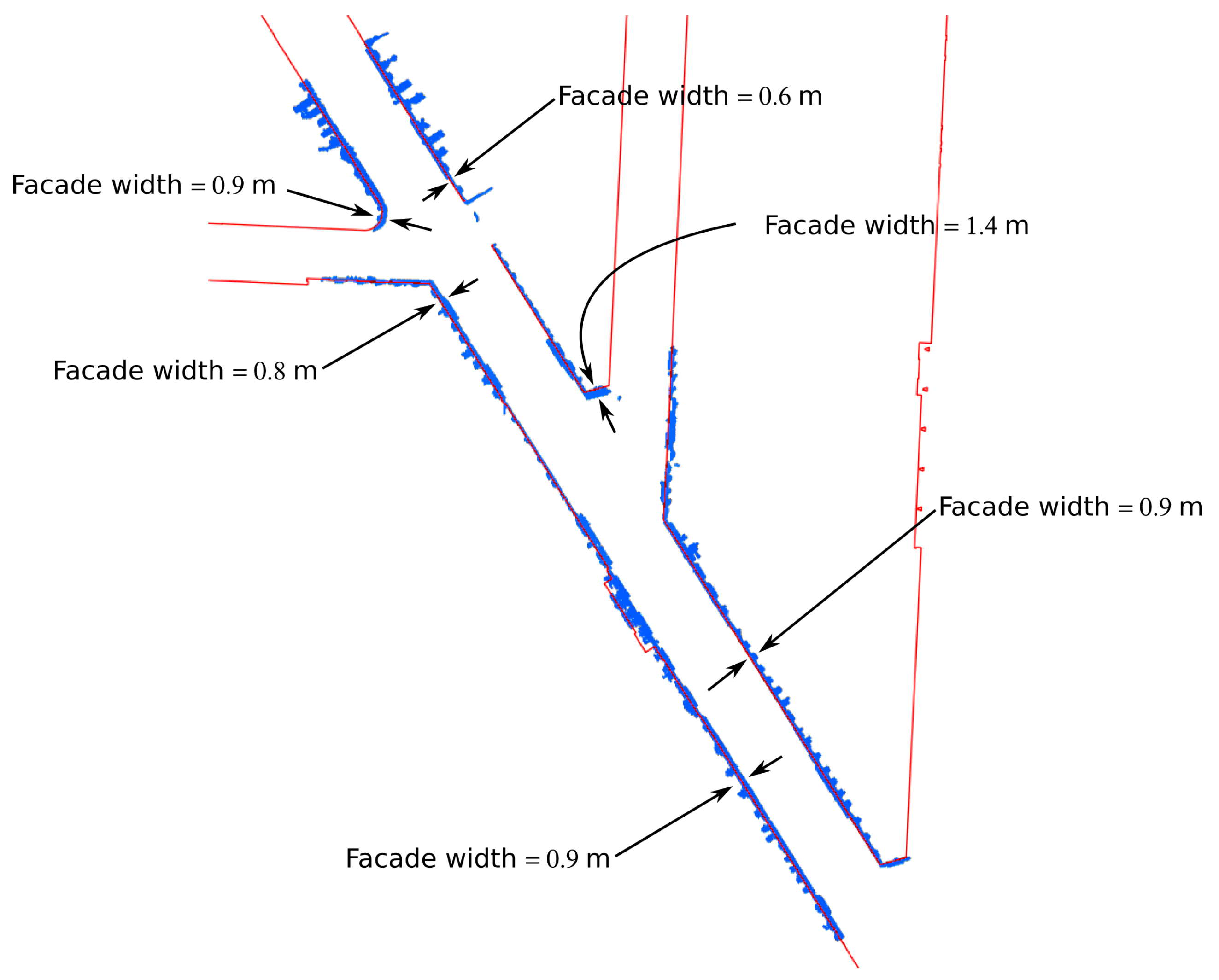 - , defining the minimal allowed façade length. In our experiments, this variable has been set to 5 m according to architectural characteristics of our databases. This threshold is illustrated in Figure 4b. Note that small objects such as lampposts and objects behind façades are not long enough and are then eliminated.