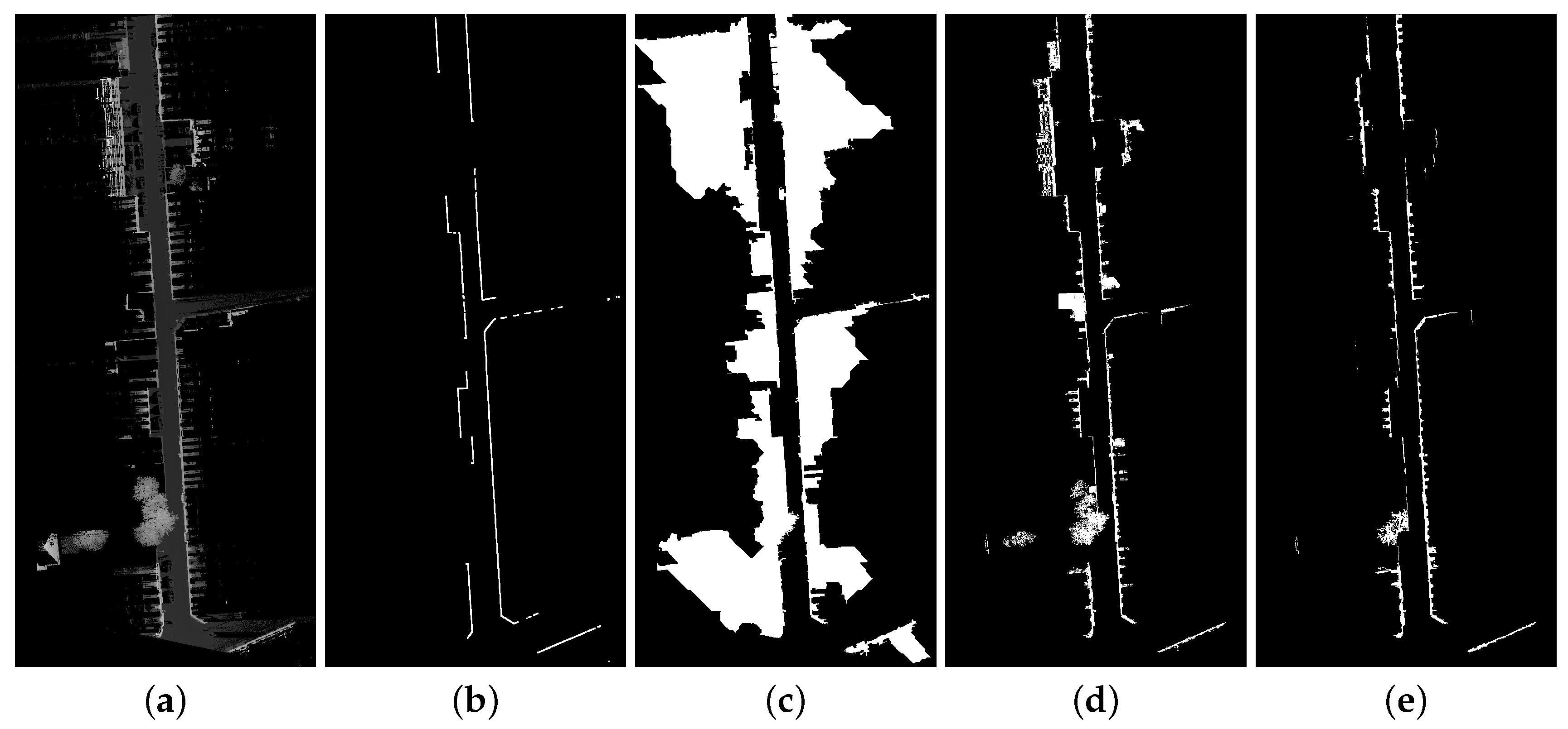 - Hernández, J.; Marcotegui, B. Filtering of artifacts and pavement segmentation from mobile LiDAR data. In Proceedings of 2009 ISPRS Workshop on Laser Scanning, Paris, France, 1–2 September; 2009; pp. 329–333. [Google Scholar]