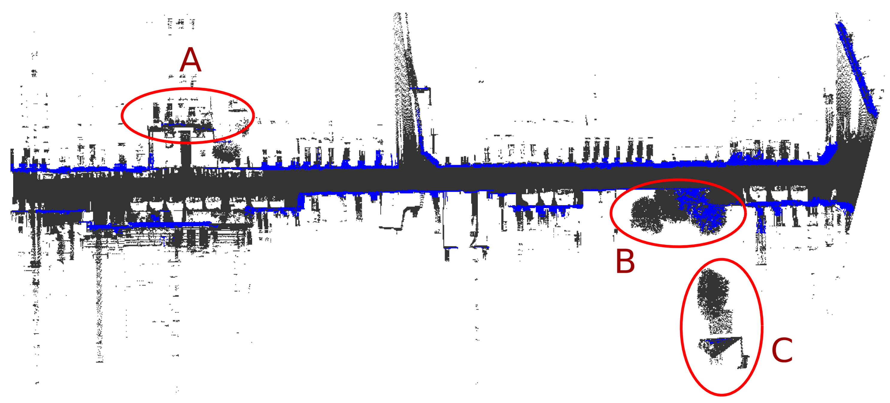 Due to specific requirements in our TerraMobilita datasets, several 3D point clouds have been acquired with the laser system oriented to the ground. Therefore, structures higher than 2.5 m are out of the laser field of view, as shown in Figure 5. This is challenging for methods using height constraints since high wall parts are not visible.
