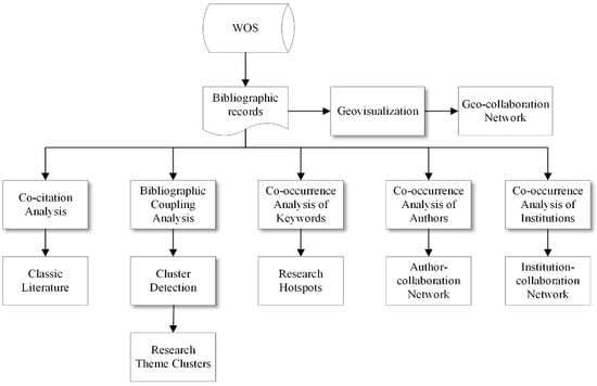 The workflow of our analysis process is shown in Figure 1. At the beginning, we extracted bibliographic records from WOS using the proper searching terms, and stored the data into text format. Then we conducted the following analysis: firstly, we used co-citation analysis to explore classic literature; next, we performed bibliographic coupling analysis to detect research theme clusters; then we employed co-occurrence analysis to identify research hotspots and generated collaboration networks at author-level and institution-level, as well as a geo-collaboration network based on the geovisualization method. Some skills should be needed to manipulate the network for better interpretation that will be discussed in Section 5.