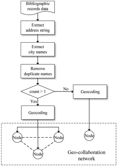 In the process, geovisualization is a key step to explore the spatial distribution and connection of scientific power. Geovisualization comprises the theory, methods, and tools for visual exploration, analysis, synthesis, and presentation of geospatial data. It draws on and integrates approaches from visualization in scientific computing, information visualization, cartography, image analysis, exploratory data analysis, and GIS []. Although the original bibliographic records are not geospatial data, we can extract the location-based information from text-format bibliographic records. For example, for data captured from WOS, the location-based information is stored in the C1 tag as the address string (e.g., BOSTON UNIV, CTR ADAPT SYST, 111 CUMMINGTON ST, BOSTON, MA 02215). If we want to construct the city collaboration network, we can extract the city name (BOSTON) from the address string. As a paper may have multiple authors, there may be several addresses; therefore, the duplicated city names should be removed. Then, city names can be parsed by a geocoding service to obtain the longitude and latitude to construct points. If there are two cities associated with one paper, a line connecting the two points will be generated to represent the collaboration between the two cities. The relationship can be mapped with a graph Gc = (Vc, Ec), in which Vc are the city nodes and Ec are edges representing the collaboration of the cities. The process of constructing a geo-collaboration network is shown in Figure 2 and the pseudocode is presented in Appendix.