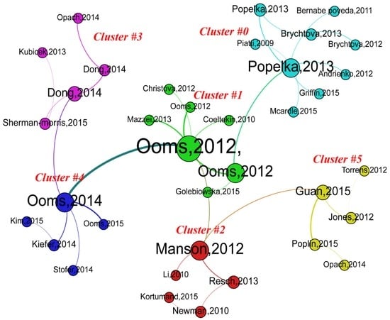 Chen [] has conceptualized a specialty as a time-variant duality between two fundamental concepts: research fronts and intellectual bases. Research fronts are defined as emergent and transient groupings of concepts and underlying research issues; the publications cited by research fronts comprise the intellectual bases. Document co-citation analysis has been used to study intellectual bases by many researchers, which allows the identification of key works [,]. It is worth emphasizing that, because document co-citation is dependent on the citing literature, its patterns can change over time.