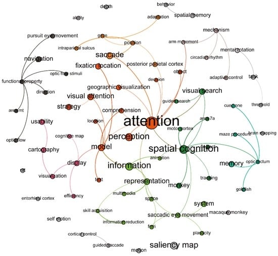 The most significant node in Figure 3 is Rayner’s article Eye movements in reading and information processing: 20 years of research, which reviewed eye movement studies in reading and other areas of information processing from 1978 to 1998 []. The second most significant node is Evaluating the effectiveness of interactive map interface designs: A case study integrating usability metrics with eye-movement analysis [], published in Cartography and Geographic Information Science, which is one of the most authoritative accounts of map usability research. Using two interactive map websites, Coltekin et al. integrated eye movement research with traditional usability methods to measure the user satisfaction, efficiency, and effectiveness of the two map interfaces. Another usability study was Jacob and Karn’s Eye tracking in human–computer interaction and usability research: ready to deliver the promises, which discussed both retrospective and real-time eye tracking in human–computer interaction []. Other remarkable works include: Itti et al. [,] proposed the saliency map model; Fabrikant et al. [] introduced sequence alignment analyses techniques from bioinformatics to eye tracking recording data analysis. Additionally, there are three books listed in Table 1: Eye tracking methodology: Theory and practice []; Eye motion and vision []; and The hippocampus as a cognitive map []. Among them, Duchowski’s book has been widely quoted and translated into Chinese; it systematically introduces the human visual system, the hardware and software of the eye tracking technique, and experimental guidelines for the use of eye tracking in many application areas.