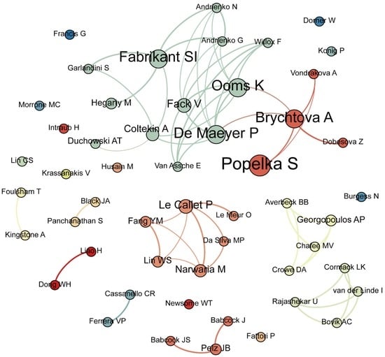 In Figure 6, it can be found that the most productive author is Popelka, who is the head of the eye tracking laboratory at Palacky University, Czech Republic. Popelka and his partner Brychtova have co-authored four works. Another significant group is led by Ooms, Maeyer, and Fabrikant. Ooms and Maeyer are from Ghent University, and they have co-authored eight works; Fabrikant is from Zurich University, who also has eight works, and we can see that there is a lot of cooperation between the two universities. Additionally, the team led by Callet and Narwaria is also outstanding, and there are four works co-authored by them. Table 4 shows the top ranked authors with more than three publications listed by publication quantity. In addition, it is important to notice that co-occurrence analysis of authors just use publication quantity as the nodes frequency. Unlike the H-index, it can only reflect the authority of scholars to some extent, and some prominent authors may not appear in this analysis result due to the fact that WOS does not index all publications in this research field.