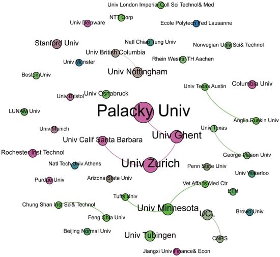 The co-occurrence analysis of institutions can detect and visualize the distribution of scientific power. Figure 7 shows the main structure of the co-occurrence network of institutions after excluding institutions with only one publication. The node size represents the frequency (i.e., the institution’s publication quantity), and the lines connecting nodes indicate the collaboration relationships between two institutions. The result indicates that collaboration always occurs between institutions with high publication quantity, such as Palacky University, Zurich University, and Ghent University, which form the core centers of the network. Minnesota University is also a significant node in the network. Other institutions with more than three publications are listed in Table 5.