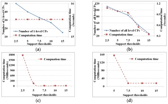 Figure 5, we know that the lower the evaluation thresholds, the greater are the number of cascading patterns, and vice versa, and the computation time of finding all cascading patterns decreases with increasing thresholds. However, the computation time to find one-level cascading patterns is fixed (i.e., 15.6 s) whether the thresholds are high or low. Given a mutual information threshold, we will get a fixed number of pair-wise related items and database scanningtimes; hence, the computation time of finding the one-level cascading patterns is fixed. As for the computation time of the linking and pruning function, theoretically it is expected to decrease along with increasing evaluation thresholds. However, when the evaluation thresholds reach a specific value (support and cascading index thresholds of 7.5% and 70%, respectively) the computation time does not change. When the threshold reaches the specific value, the linking and pruning times are too small to show changes in computation time. That is to say, when the threshold reaches the specified value, the computation time is shown as a computational unit (i.e., 15.6 ms on our test computer).