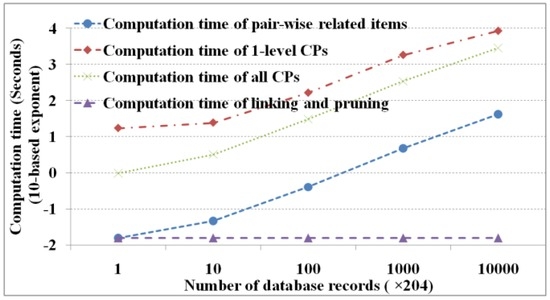 Figure 6 shows that maximum computation time occurs in finding the one-level cascading patterns then in finding all cascading patterns and pair-wise related items in order and finally in linking and pruning. The computation time is dominated primarily by the number of database scans, which is determined by the number of database records. In this experiment, there are 216 × 25 database scans to find one-level cascading patterns, 105 to find all cascading patterns, and one to construct a mutual information contingency table and obtain the pair-wise related items. Apart from the effects of the database records, the computation time of linking and pruning is fixed irrespective of a database record size. In addition, we know that except for linking and pruning, the computation time increases exponentially with an increase in the number of database records.