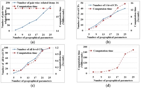 Figure 7a). The reason lies in that the computation time focuses on discrimination times, which changes from 5 × 4, 9 × 8, 13 × 12, 17 × 16, 21 × 20 to 25 × 24. Comparative to the computational abilities, the computation time for discriminating pair-wise related items gives no significant change.