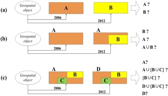 In the first case (Figure 1a), we observe the entire geospatial object’s LULC changing over time. The geospatial object demonstrates two distinct LULC attributes at different timestamps: A in 2006 and B in 2012. Semantic models need to integrate both definitions of this object. For the second case (Figure 1b), local attributes change within an otherwise globally-uniform object. The geospatial object contains only one attribute A in 2006 while maintaining most of that attribute with partial attribute B changes in 2012. When constructing a semantic model for the attributes of this geospatial object, it will be difficult to categorize, as it could plausibly be described as A, B or even A and B simultaneously (the case in Figure 1b). In the third case (Figure 1c), the global attribute of the object may change while local attributes remain the same. In 2006, the geospatial object has a global attribute A and contains two subsets B and C. In 2012, the global attribute A changes to the global attribute D while the local attributes C and B remain unchanged. During semantic modeling for this geospatial object, the categories become much more complex as the geospatial object may be described as A, D, or “B and C”, or as an even more complicated expression, such as A with subsets of B and C or D with subsets of B and C.