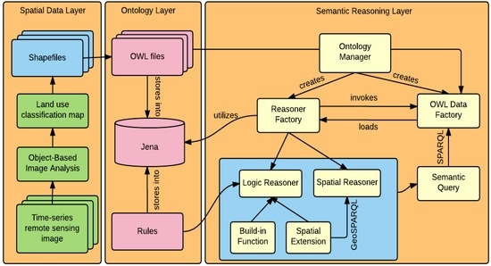 To support the semantic query and reasoning about LULC change in an automatic and intelligent manner, the ontology or knowledge base must be established in a machine-understandable way. Therefore, a semantic query and reasoning framework was built to support the dynamic query and reasoning of the change data, both spatially and non-spatially. Figure 3 depicts the three-layer software framework to accomplish this.