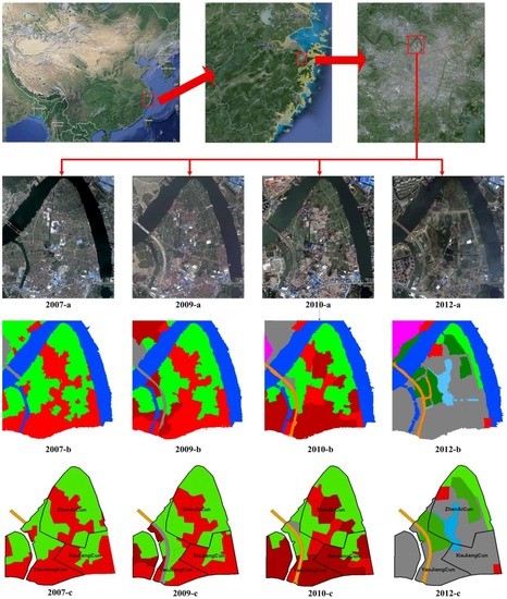 Wantou consists of three villages, ZhenAiCun (Zhenai Village), XiaJiangCun (Xiajiang Village) and YaoJiangCun (Yaojiang Village), and the Wantou Bridge. In Figure 4, 2007-a, 2009-a, 2010-a and 2012-a show the original QuickBird images taken in 2007, 2009, 2010 and 2012. 2007-b, 2009-b, 2010-b and 2012-b show the classification results of the four original images using the aforementioned OBIA approach. 2007-c, 2009-c, 2010-c and 2012-c depict the GIS-generated classification results. The land use category is displayed in different colors. Red is residential land, brown, vacant land, light green, farmland, dark green, green land, orange, transportation avenues, grey, construction sites, and blue, lakes. The land use composition of Wantou’s sub-components from 2007 to 2012 are shown in Table 2.