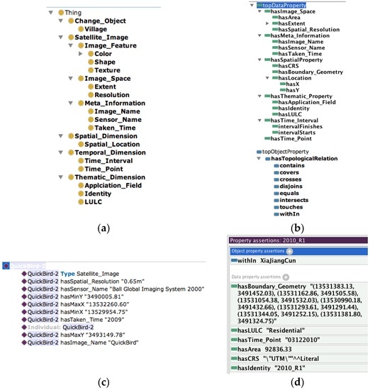 A visualized ontology segment for geospatial semantic modeling demonstration. (a) Defines all of the classes; (b) defines the data properties (such as the metadata information about an image, the spatial and temporal properties of a spatial object), as well as the object property (such as the topological relations among different objects); (c) a visual definition of triples for a QuickBird image from which the spatial objects are extracted; (d) a spatial object named “2010_R1” and its various properties. For instance, the spatial reference information is defined in “hasCRS” (Coordinate Reference System).