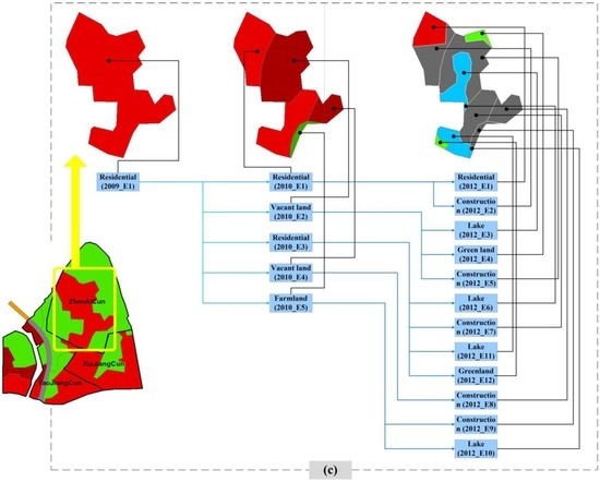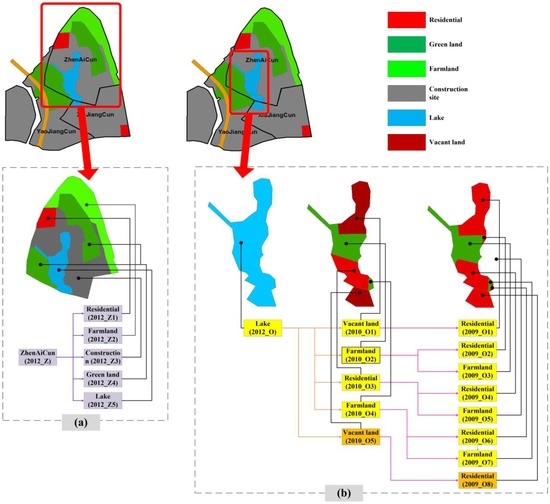 Since there has been a very complex variation of land use in Wantou Community, we select three change objects for demonstration. First, we select ZhenAiCun (ID: 2012_Z) in 2012 to show its current LULC information. Then, the historical LULCC trajectory for the geospatial object Xinhu Lake (ID: 2012_O) before 2012 is shown. In 2012, the northern part of the lake 2012_O1 belongs to ZhengAiCun, and the southern part 2012_O2 belongs to XiaJiangCun. Finally, we show the trend of LULCC at geospatial object Miaoqianzhou (ID: 2009_E1) from 2009 to 2012.