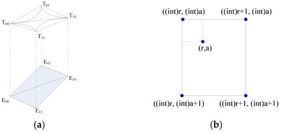 - SAR image simulation: The original simulation result of the SAR image can be obtained by using the LUT and the projections on the γ plane. Since the coordinates in the LUT were not integers, the area should be assigned to the neighbor pixel cell. Then, it can be realized through a bilinear interpolation procedure shown in Figure 2b, where (int) means integer operation.