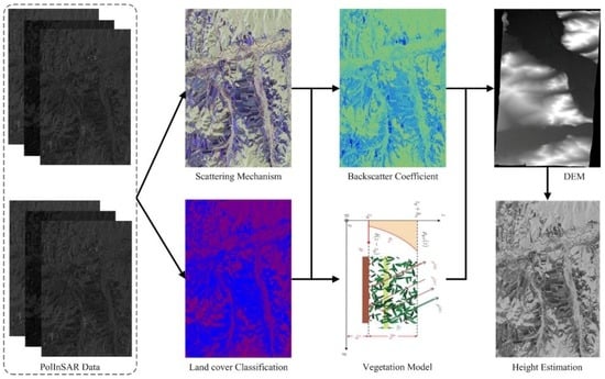 The framework of the proposed method is shown in Figure 4. First, the scattering mechanism classification procedure is exploited based on the PolInSAR data for land cover scattering classification. Then, the iteration-based backscattering optimal method is investigated to obtain the backscattering coefficient which is the most sensitive to terrain distortion. The details are described in Section 3.1. Then, the radiometric terrain correction method is investigated to eliminate the effect of terrain undulation described in Section 3.2. Finally, after Fisher’s alpha-Diversity estimation, the RVoG model based three-stage inversion procedure is introduced to obtain the vegetation vertical structure parameters.