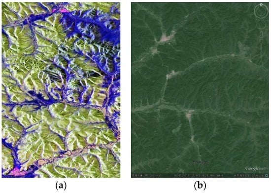 Test data sets in Genhe, the Great Xing’an Mountain area, China: (a) ALOS PALSAR data; and (b) optical data.