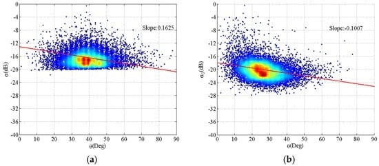 Table 3, Figure 6 and Figure 7 presents the results of different terrain correction algorithms as applied to the ALOS PALSAR data for Genhe, China. To compare the performance of the test algorithms, the scatter plots in Figure 7 are presented to show the slope between the incident angle and backscatter coefficient of different terrain correction methods. In total, 100,000 points are selected using the Gaussian random sampling method from the original SAR image. Then, the least squares method is investigated to obtain the slope between the local incident angle and backscatter coefficient. To eliminate the random error of sample selection, these procedures are repeated five times, and the final slope is the average value. From the original SAR data in Figure 6a, we can see that the mean value of backscattering is the lowest, with the largest standard deviation of 4.9883 dB, which indicates that the effects of terrain undulation decrease the backscattering signal and increase the uncertainty of backscattering estimation. The terrain undulation and backscattering coefficient is strongly correlated since the backscattering value is decreasing with the increase in the local incident angle in the original SAR imagery, and the slope is −0.1625. For the RD method, although the mean value of backscattering is increasing when compared with the original SAR image, the standard deviation is still over 4 dB; we can see some “high light” area in Figure 6b. Unlike the RD method, the radiometric normalization approach restrains the “light” phenomenon in the SAR image; the slope is −0.0845. Thus, the correction rate is increasing, but the performance has a slight increase in the slope area, which suggests that local terrain and backscattering are still correlated. The proposed method considers the effects of terrain induced variance of the incident angle, so the correlation between the local incident angle and backscattering diminishes. As a result, it has the largest slope of −0.0322, and the correction rate on the proposed method is over 30%. The computation time of the RD based method, radiometric normalization method and the proposed method on the ALOS PALSAR data set is 23, 28 and 35 min, respectively. To investigate the statistical significance of the sample selection, we calculated the slope using different sample points including 1000, 10,000, 100,000 and 1,000,000 and whole points of the imagery in the ALOS PALSAR data with the four methods. The mean slope and relative error are illustrated in Table 4. The mean slope is the mean value of the slope using different sample points in five instances, and the relative error is calculated as in Equation (29) below, where ssample means the mean value of the slope using different sample points and simg represents the slope calculated using the whole points of the image. The results in Table 4 indicate that the accuracy of the slope is increasing with the increase in sample points. The relative error using 100,000 and 1,000,000 is less than 5%, which indicates a higher statistical significance with respect to the whole data set. More sample point means a greater calculation time, so we choose 100,000 sample points to calculate the slope in our experiments.