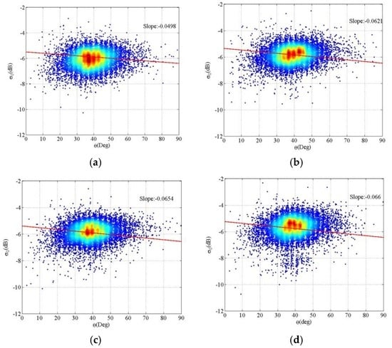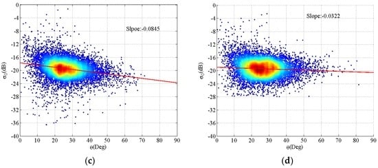 The results of the proposed method on the RADARSAT-2 image with four different acquisition times are illustrated in Figure 8 and Figure 9 with a calculation time of 32 min on each scene. The scatter plots in Figure 9 are obtained using the same method as in Figure 7. Table 5 gives the quantative results of terrain correction on the proposed algorithm. We can see that all correction rates on the four images are greater than 20%, with a slope of around −0.06. The result for data obtained on 23 May 2013 had the largest slope when compared to the other three images, which means that the backscattering coefficients are less correlated to the local incident angle. There are many factors that may cause the variance in the backscattering coefficients. June to August 2013 was the growth period for grasses and crops, which may explain why the slope in Figure 9a is larger than the slope of the other three results. Soil moisture is another factor leading to the variance in backscattering. The meteorological data reported that it did not rain during the SAR data acquisition time, so the soil moisture may not be the main factor that causes the variance in backscattering. This experiment indicates that vegetation parameters are also correlated to backscattering, which may also influence the result of terrain correction.