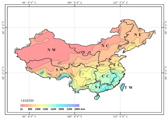 Research area and spatial distribution of precipitation across eight regions in China: central China (CC), east China (EC), north China (NC), northeast (NE), northwest (NW), south China (SC), southwest (SW), and Taiwan (TW).