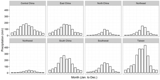 Monthly mean precipitation for the period 1961 to 2014 in eight regions in China: central China, east China, north China, northeast, northwest, south China, southwest, and Taiwan.