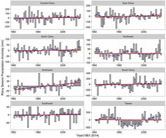 Trend in rainy season (April to September) precipitation anomaly (difference between annual precipitation and long-term average precipitation) from 1961 to 2014 across central China, east China, north China, northeast, northwest, south China, southwest, and Taiwan. Red solid lines indicate linear trend in precipitation anomaly time series, and dashed blue lines show Local Polynomial Regression Fitting (loess regression in R) of rainy season precipitation anomaly.
