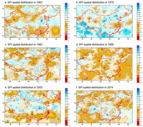 Spatial distribution of six-month (rainy season: April to September) SPI across China in 1963, 1978, 1982, 1996, 2003, and 2014. Red crosses indicate drought locations, while blue crosses indicate flood locations. SPI spatial distribution was interpolated using Kriging method in Surfer 10.0. (a) SPI spatial distribution in 1963; (b) SPI spatial distribution in 1978; (c) SPI spatial distribution in 1982; (d) SPI spatial distribution in 1996; (e) SPI spatial distribution in 2003; (f) SPI spatial distribution in 2014.