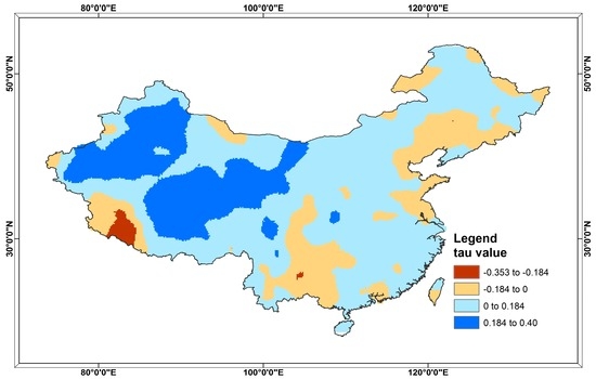 Results from Section 3.1 show that monthly precipitation can explain historical drought/flood events. We thus use rainy season SPI time series from 1961 to 2014 to analyze wetness/dryness trend in this study period. The Mann-Kendall nonparametric correlation test coefficient (τ) values of 3804 precipitation stations (Figure 5) indicate a regional heterogeneity to the trend in wetness/dryness that occurred in China Between 1961 and 2014. The Mann-Kendall correlation test indicates that most areas in east China show a non-significant upward or downward trend (Figure 5). However, in west China (northwest of Xinjiang Province, parts of Qinghai, and Tibet), the SPI shows a significant upward trend, and a downward trend appears in southwest Tibet and a small area in Yunnan Province (Figure 5). This indicates that the frequency of floods and droughts in these regions may be increasing.