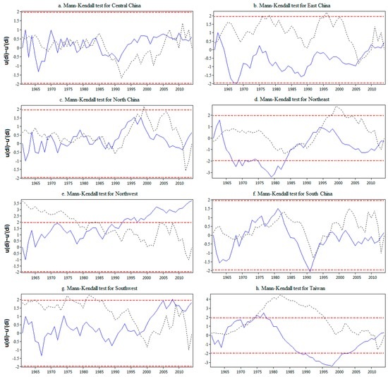 Sequential Mann-Kendall test for SPI time series from 1961 to 2014 in (a) central China; (b) east China; (c) north China; (d) northeast; (e) northwest; (f) south China; (g) southwest; (h) Taiwan. Blue line denotes SPI progressive series, black dotted line is retrograde series, red dotted line indicates 95% confidence interval (u = 1.96 or u = −1.96).