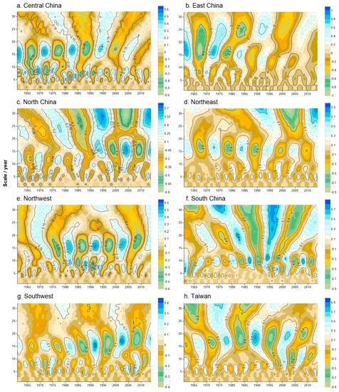 Wavelet coefficient counter map of SPI in China for 1961–2014 in (a) central China; (b) east China; (c) north China; (d) northeast; (e) northwest; (f) south China; (g) southwest; and (h) Taiwan.