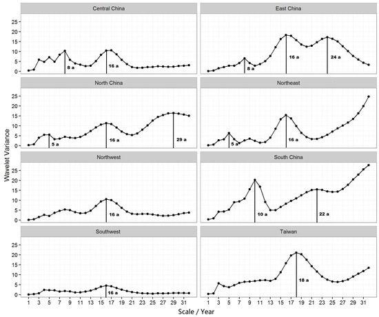 Variance of Morlet wavelet transform coefficients for SPI time series in east China, north China, northeast, northwest, south China, southwest, and Taiwan from 1961–2014.